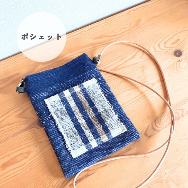 【再販売】紺色の裂き織りポシェット|取り外し可能ストラップ付き・和の風合いと革のナチュラル感