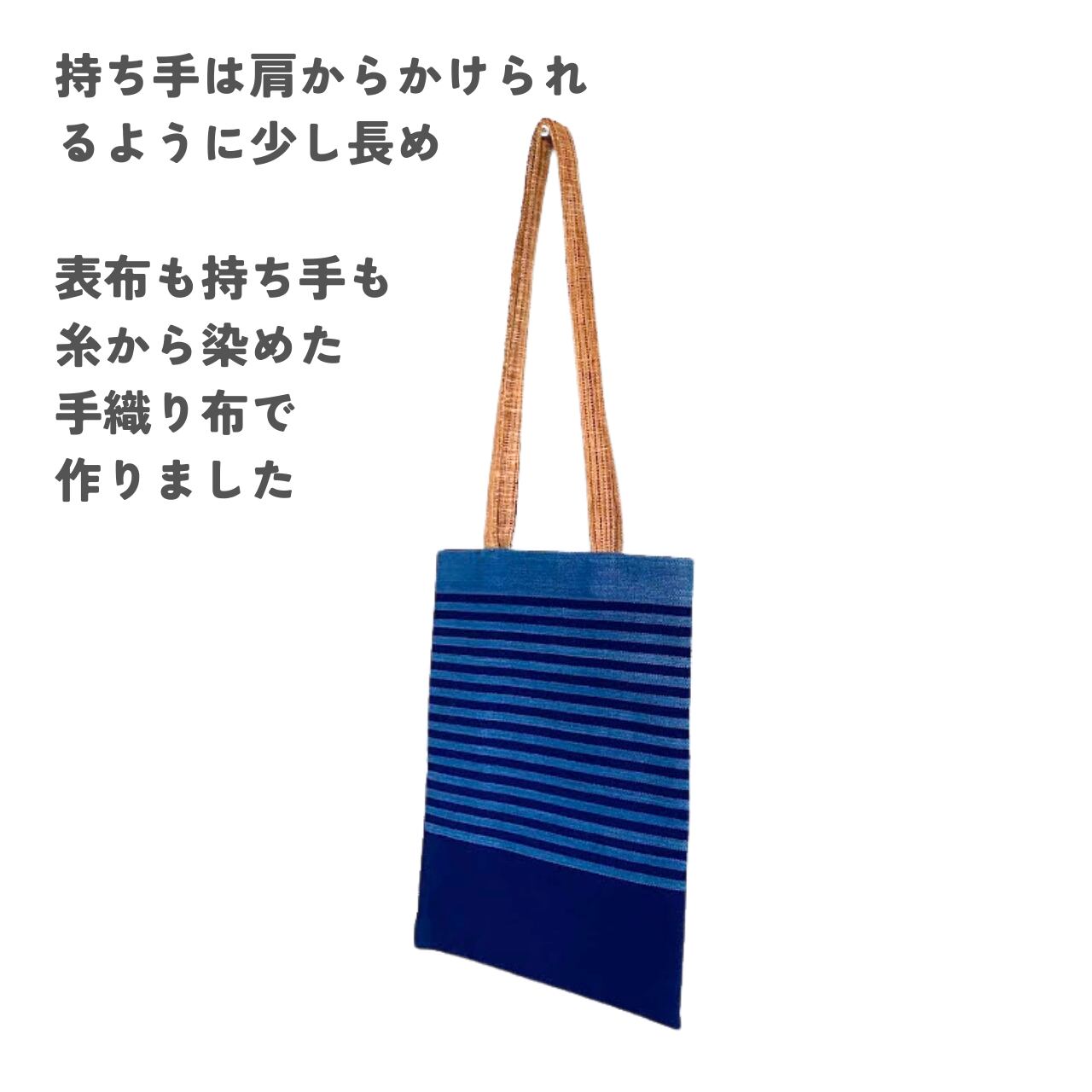 木綿の糸を藍・インド藍と柿渋で染め、一枚一枚手織りした布から仕立てたトートバッグです。