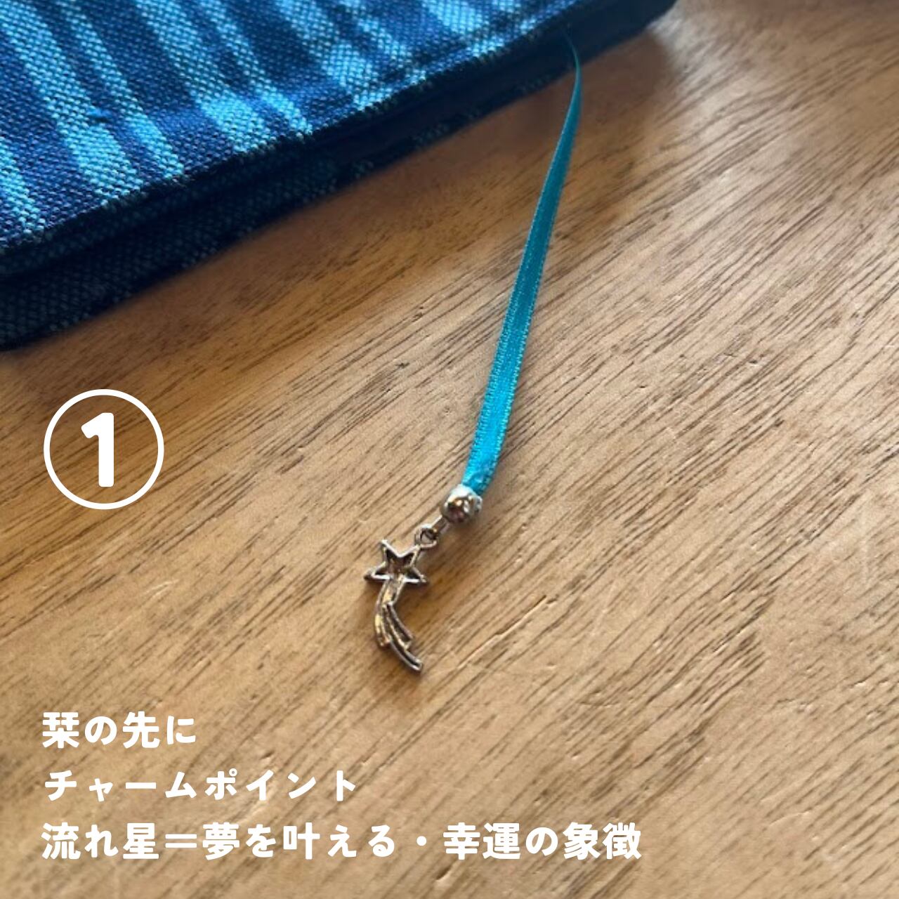先端には、夢を叶える幸運の象徴「流れ星」と、飛躍・運気上昇の象徴「羽」のチャームを添えて、ちょっとした遊び心と幸運をプラス。
