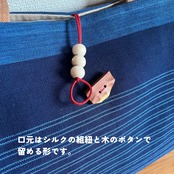 口元は、骨董市で出会った木のボタンと、宇治の老舗組紐屋さんの紐を用い留める仕様。細部まで手仕事の美しさが息づいています。