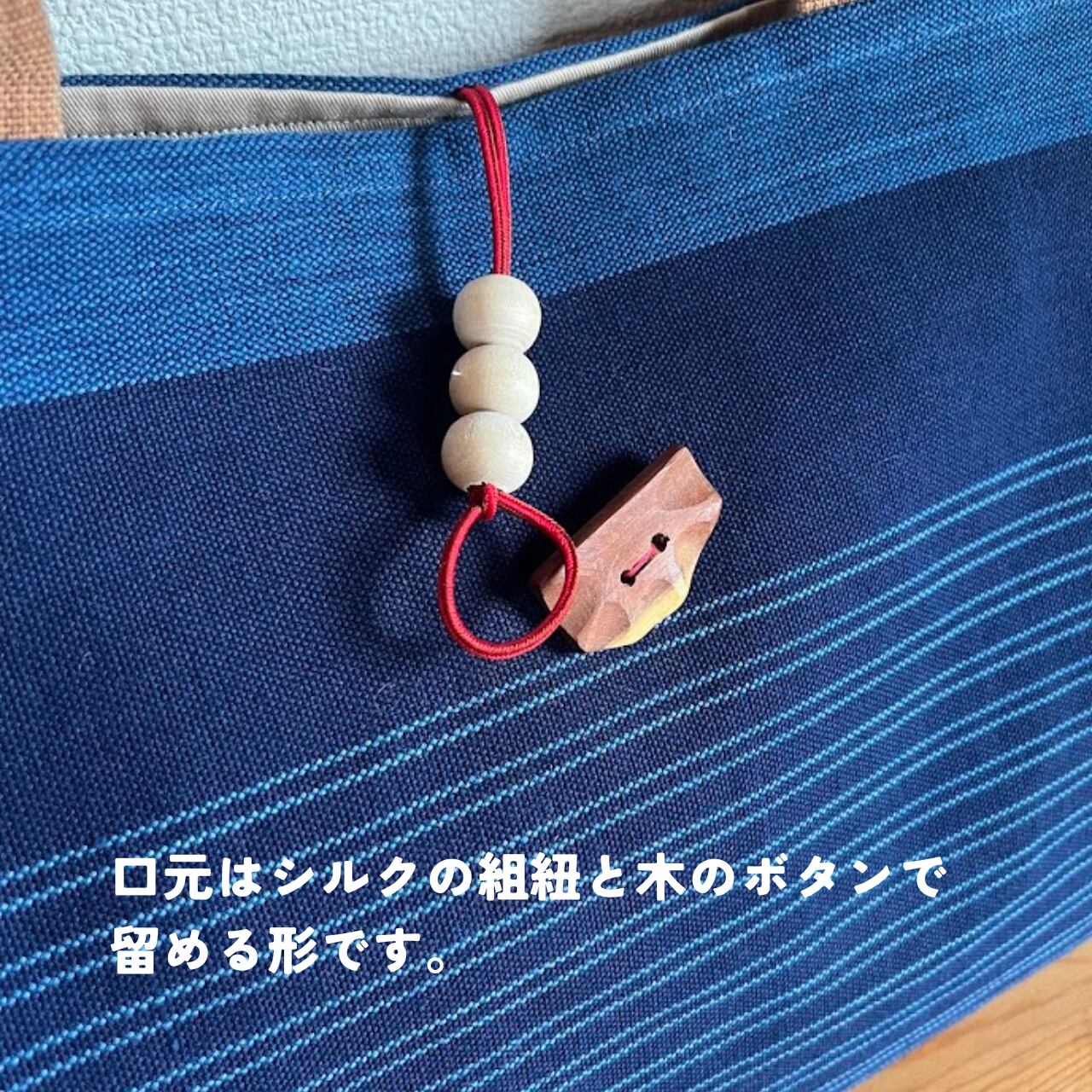 本体のストライプは、藍色の濃淡がつくる渋みの中に、どこかかわいらしさも感じられるデザイン。和の装いにも洋服にも自然に馴染み、季節を問わず活躍します。