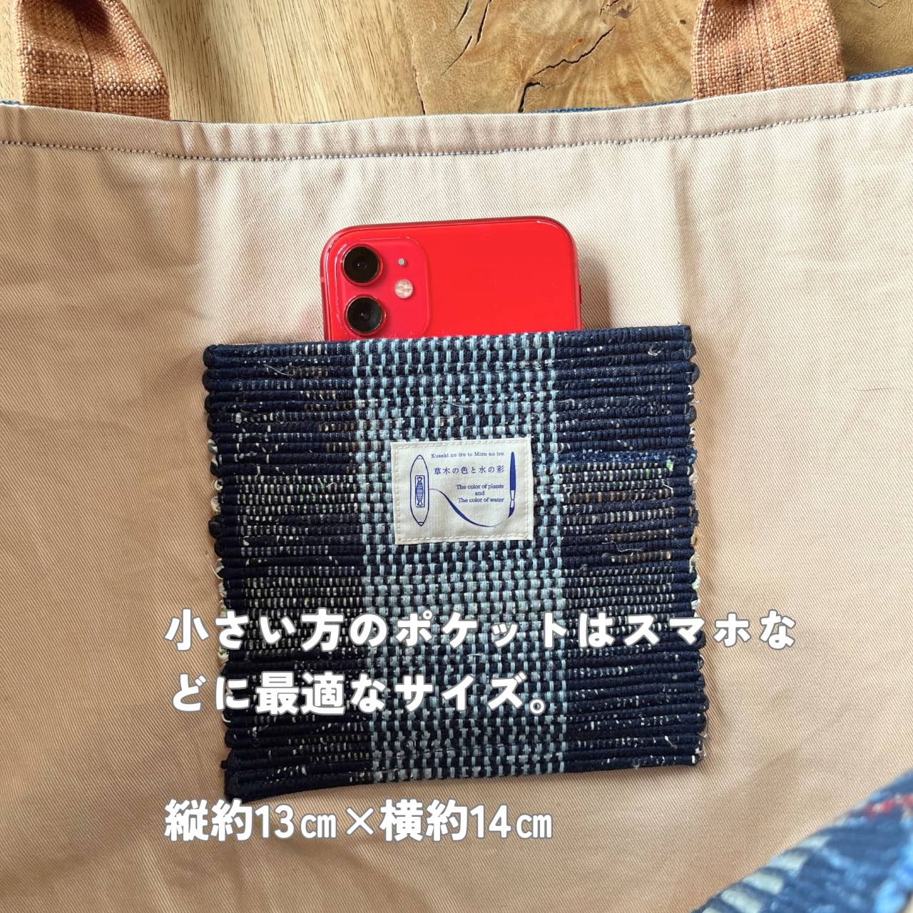 約13cm × 14cm の裂き織り布のポケット(スマホや鍵など小物入れに最適)