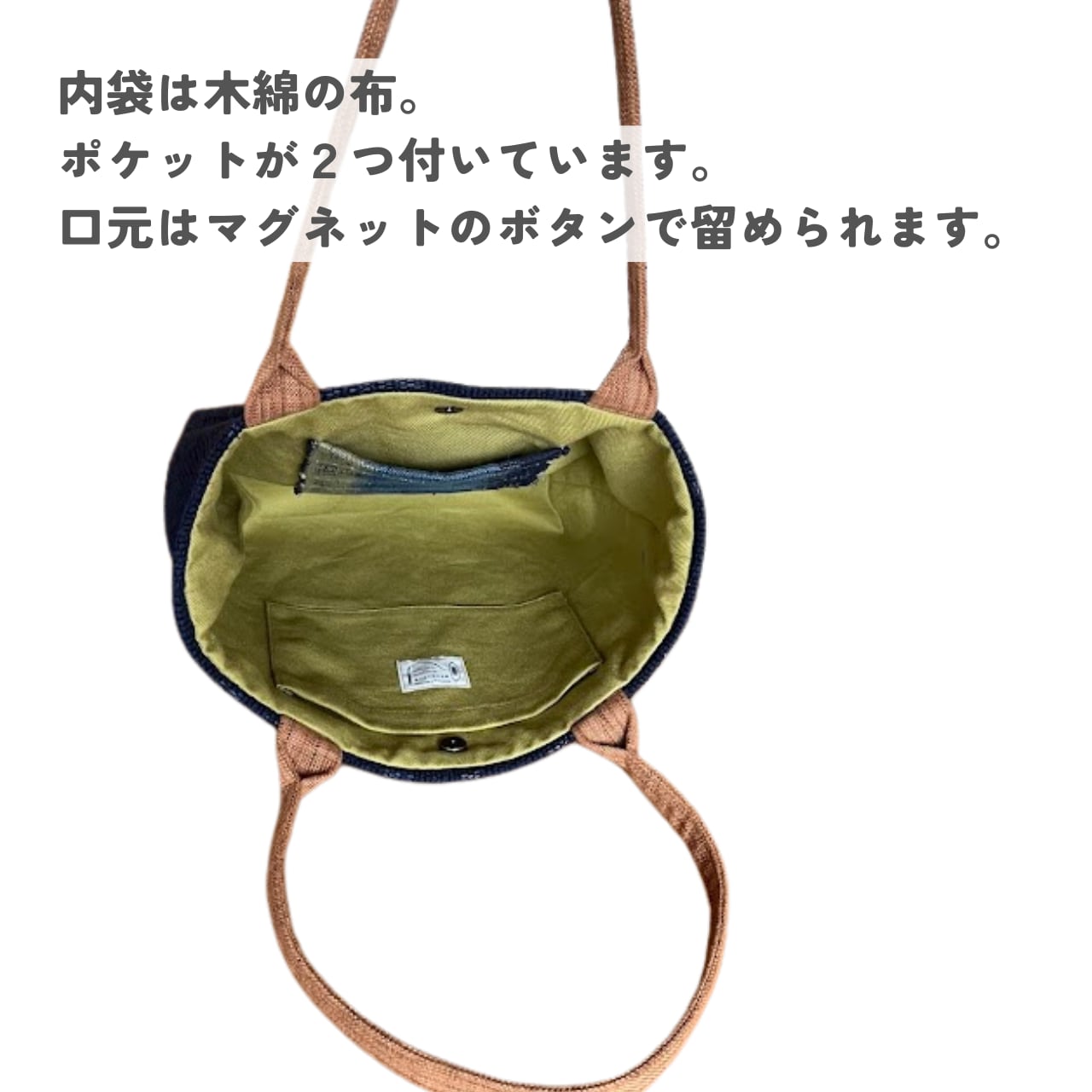 内側には明るいグリーンの内布を合わせています。ちらりと見える色がアクセントになり、持ったときの気分まで軽やかにしてくれるよう。厚手の布を使っているので、しっかりとしており、全体がぽってりと温かみのある雰囲気に仕上がりました。