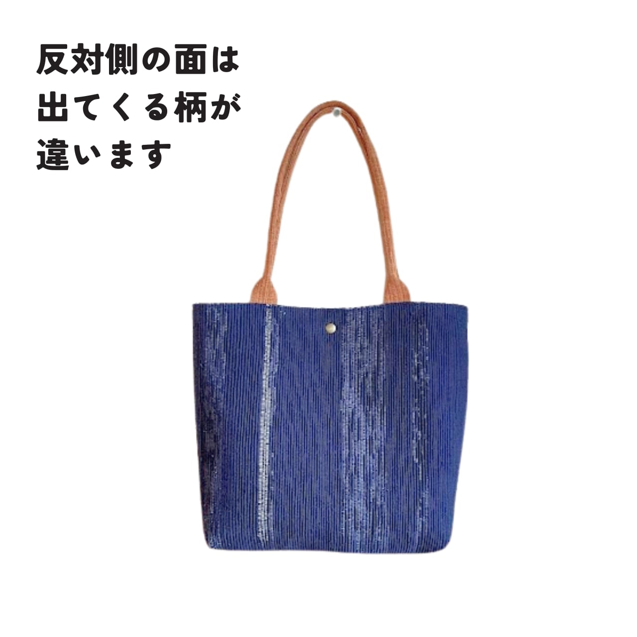 浴衣地や絣の着物を丁寧にテープ状にして、一本一本織り重ねて仕立てた裂き織りのバッグです。