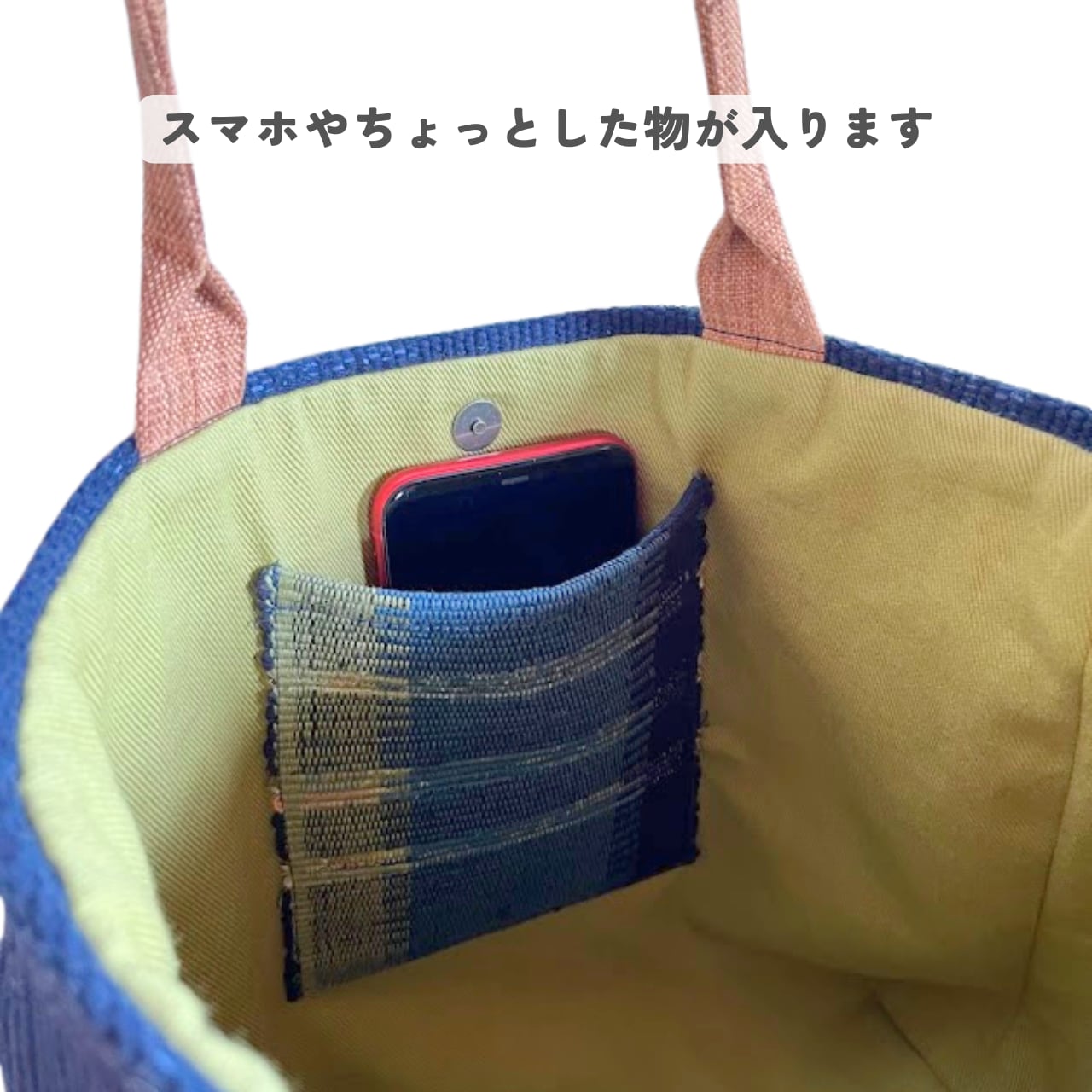 【手織りの裂き織りトート|浴衣地×絣×柿渋染め|和の布を使った一点ものバッグ】