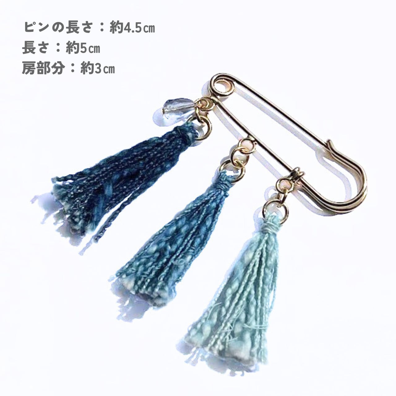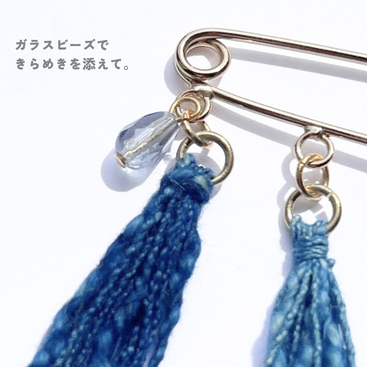 藍染め糸の落ち着いた質感に、ブルーのガラスのビーズがひとしずくの光と華やぎを添えてくれます。
