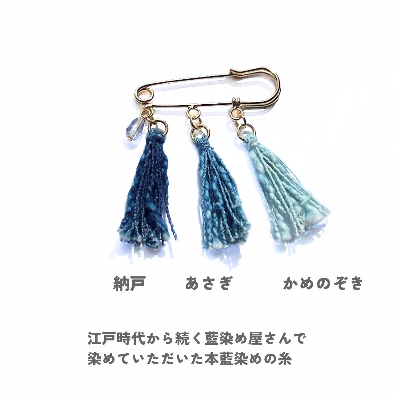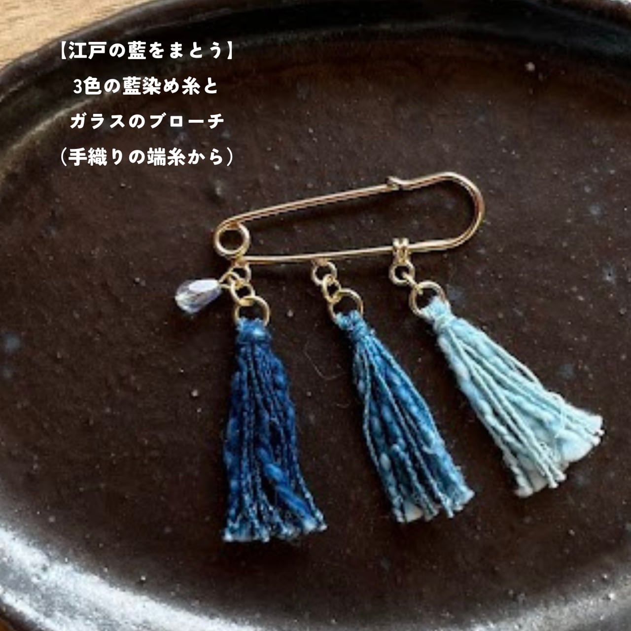 【江戸の藍をまとう】3色の藍染め糸とガラスビーズのブローチ(手織りの端糸から)