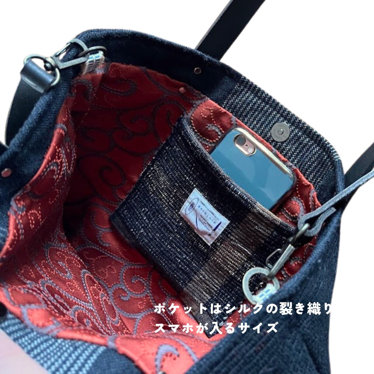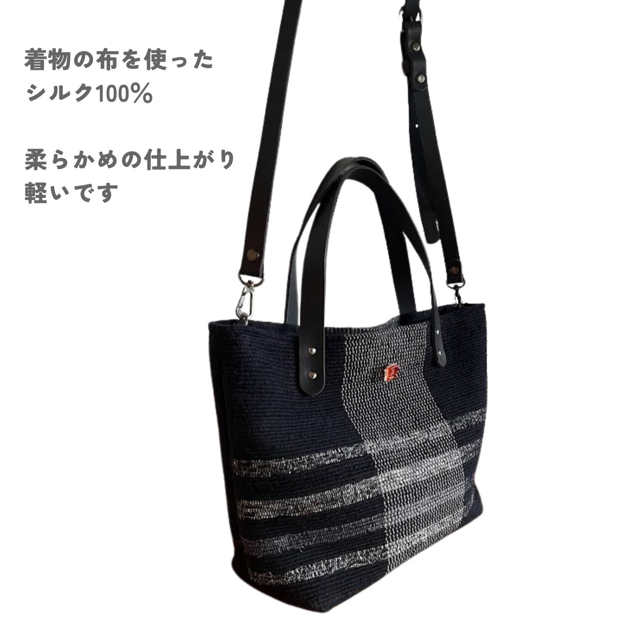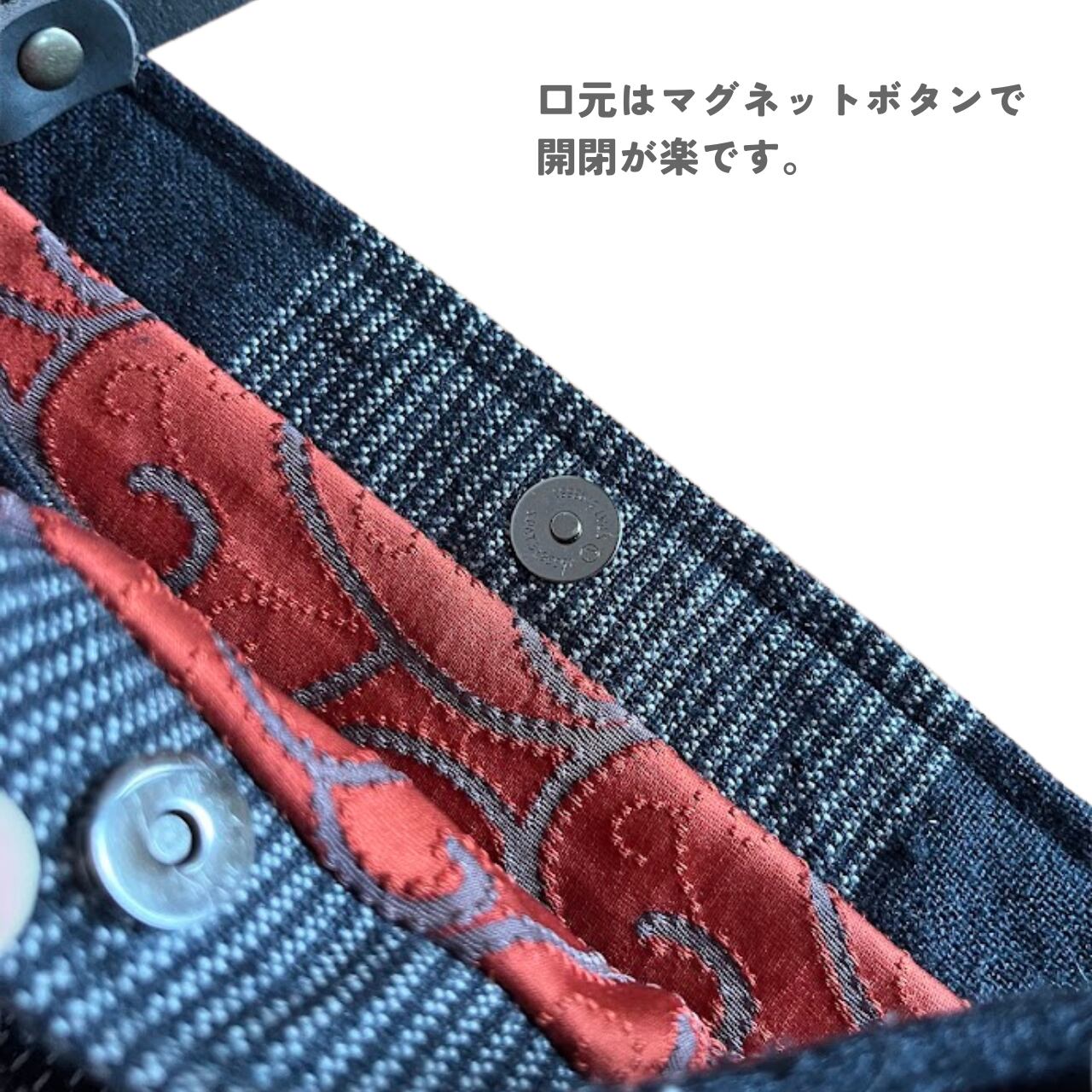 ・素材:本体(シルク・裂き織り)、内布(シルク・着物布)、持ち手・肩紐(本革)、パーツ(ガラスボタン)、金具