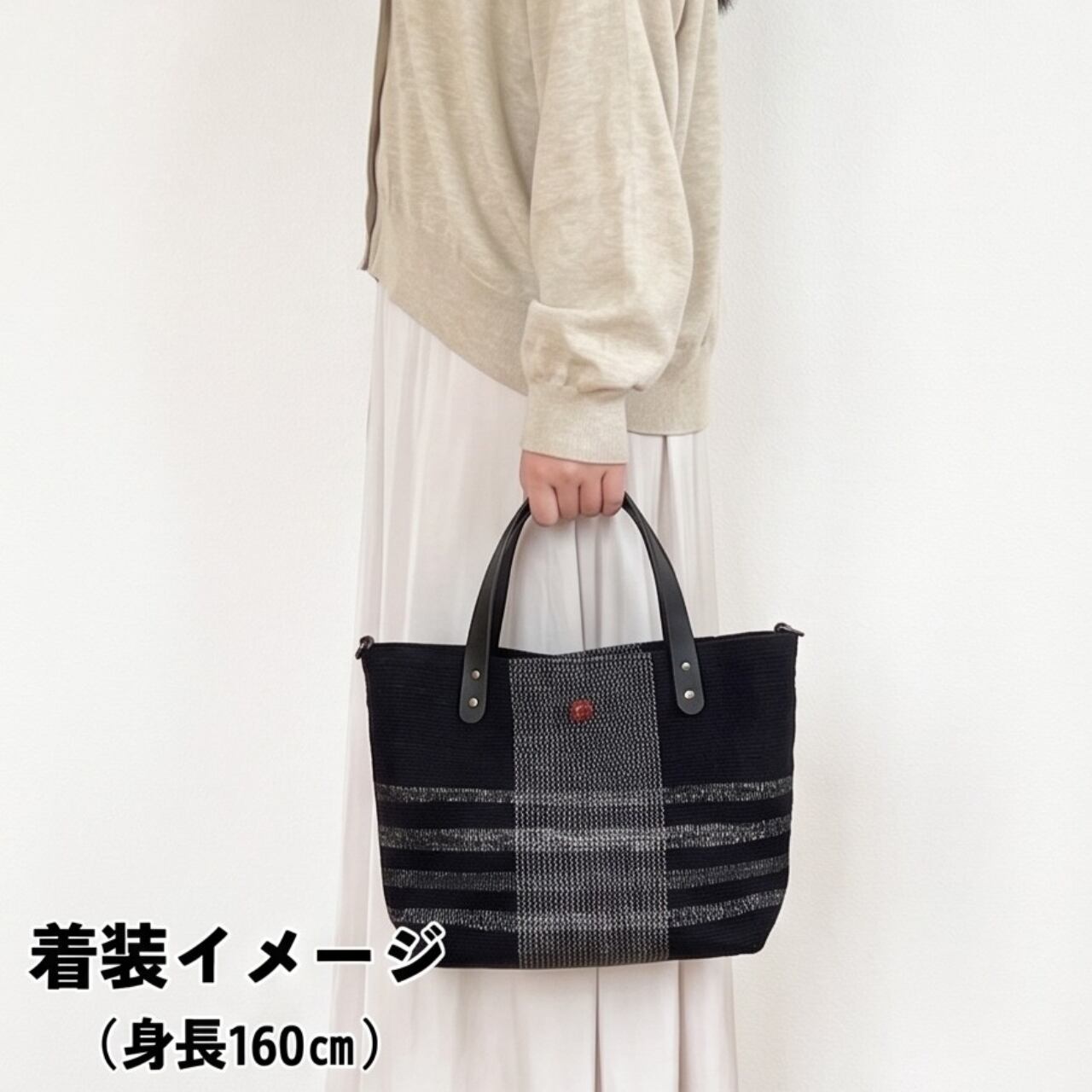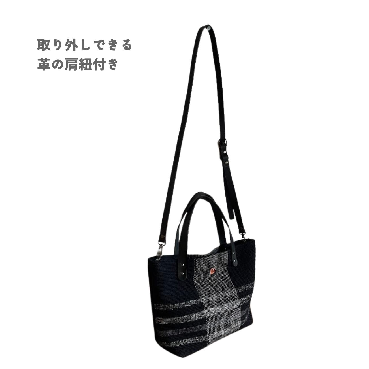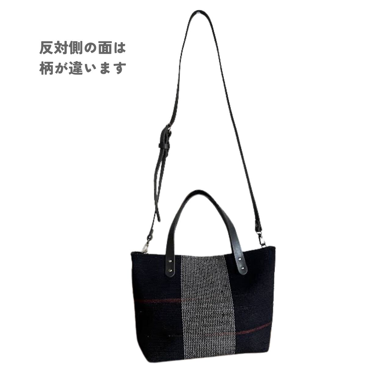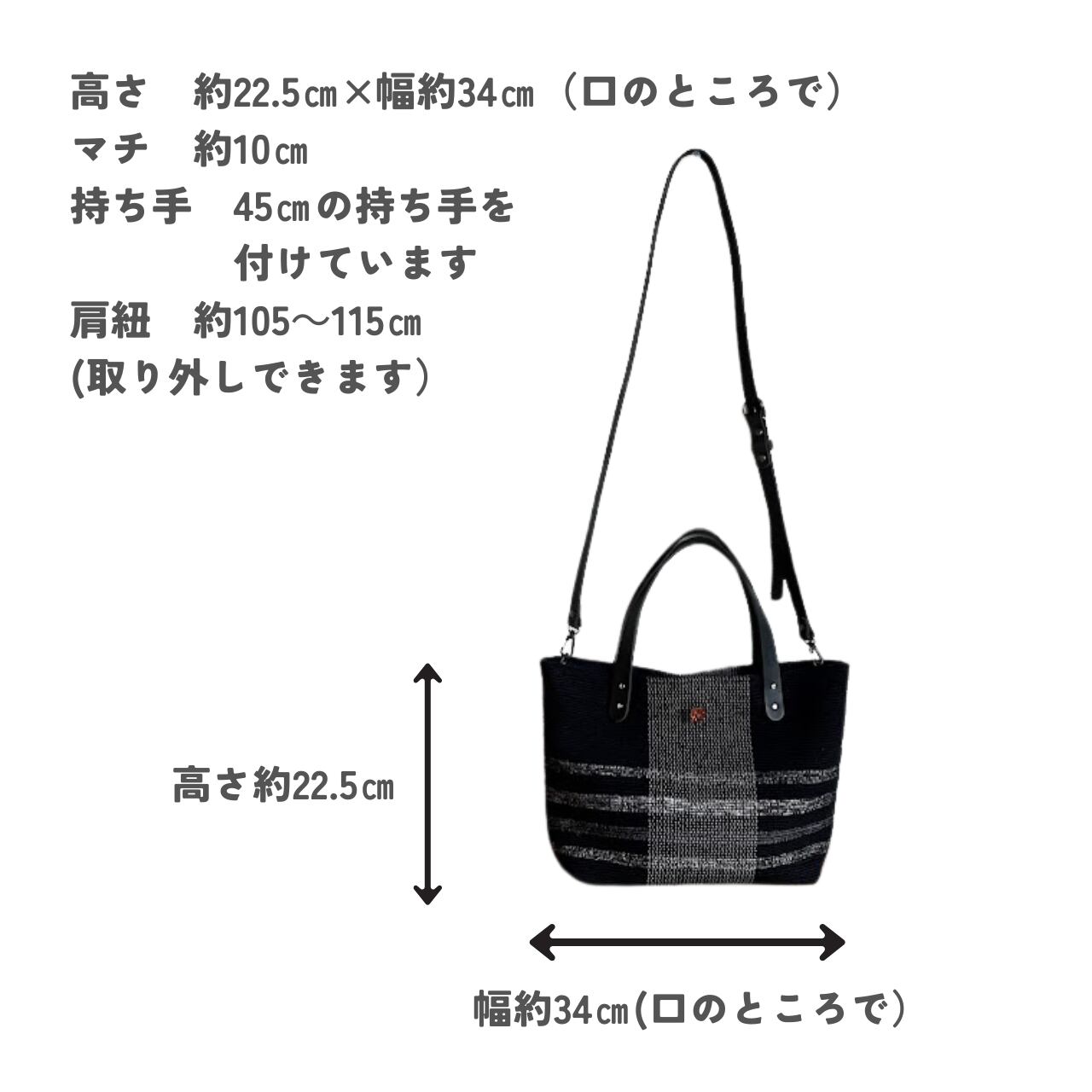・素材:本体(シルク・裂き織り)、内布(シルク・着物布)、持ち手・肩紐(本革)、パーツ(ガラスボタン)、金具