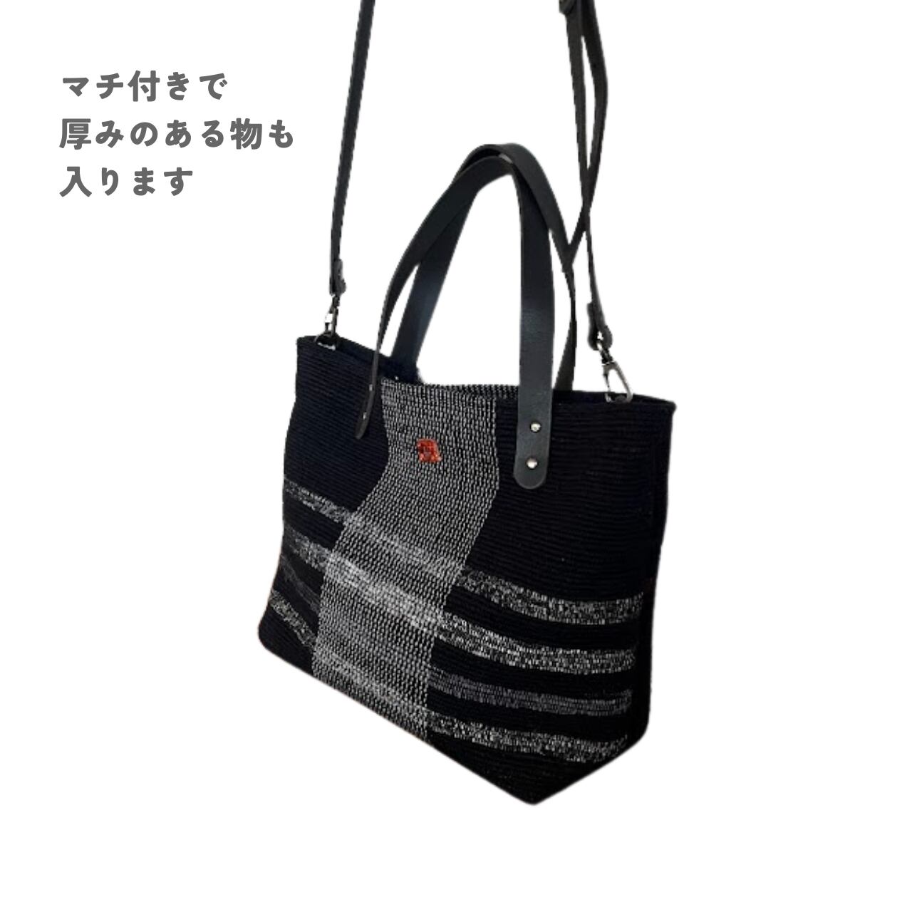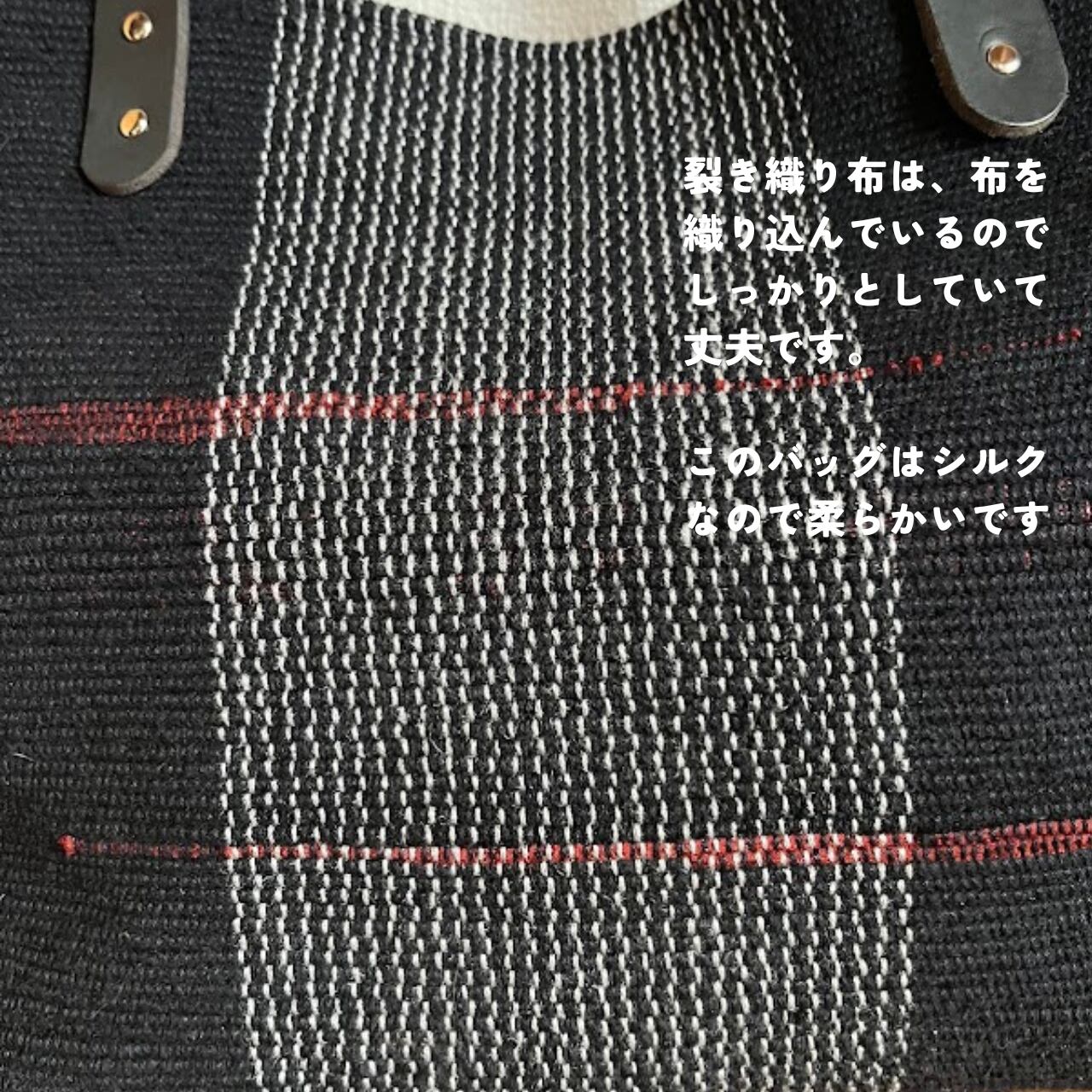 【一点物】黒のシルク裂き織りバッグ|革の持ち手と朱色のガラスボタン(2WAY仕様)