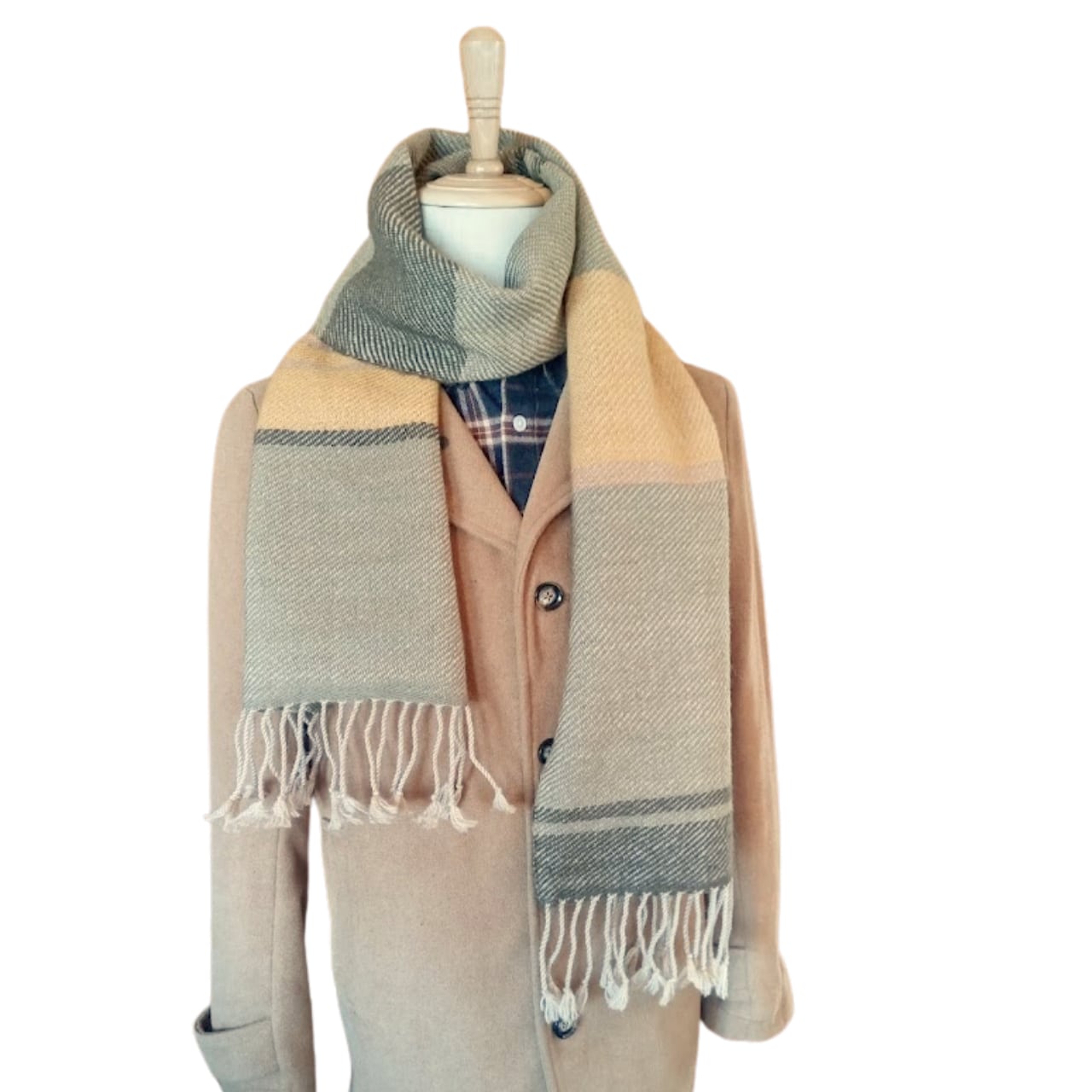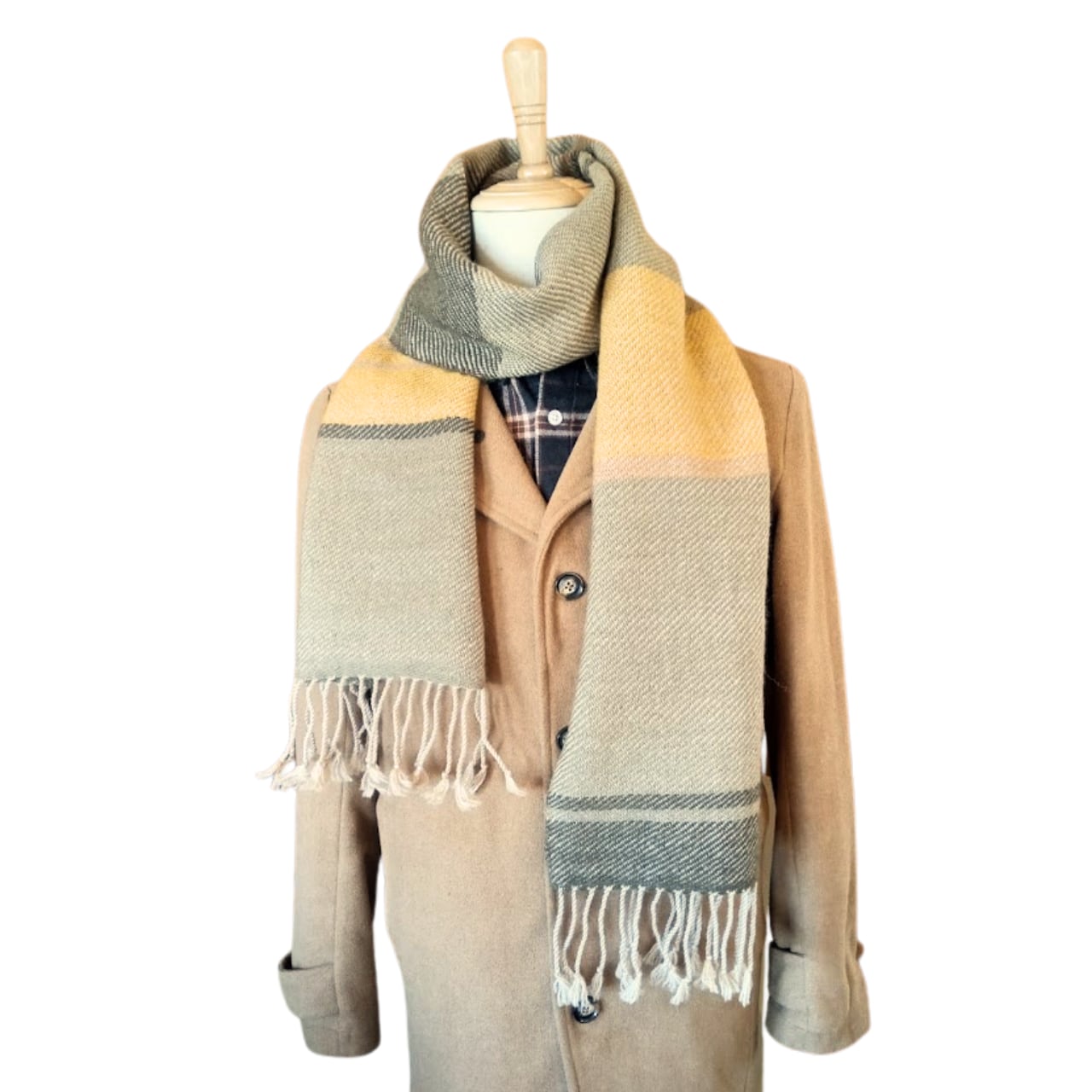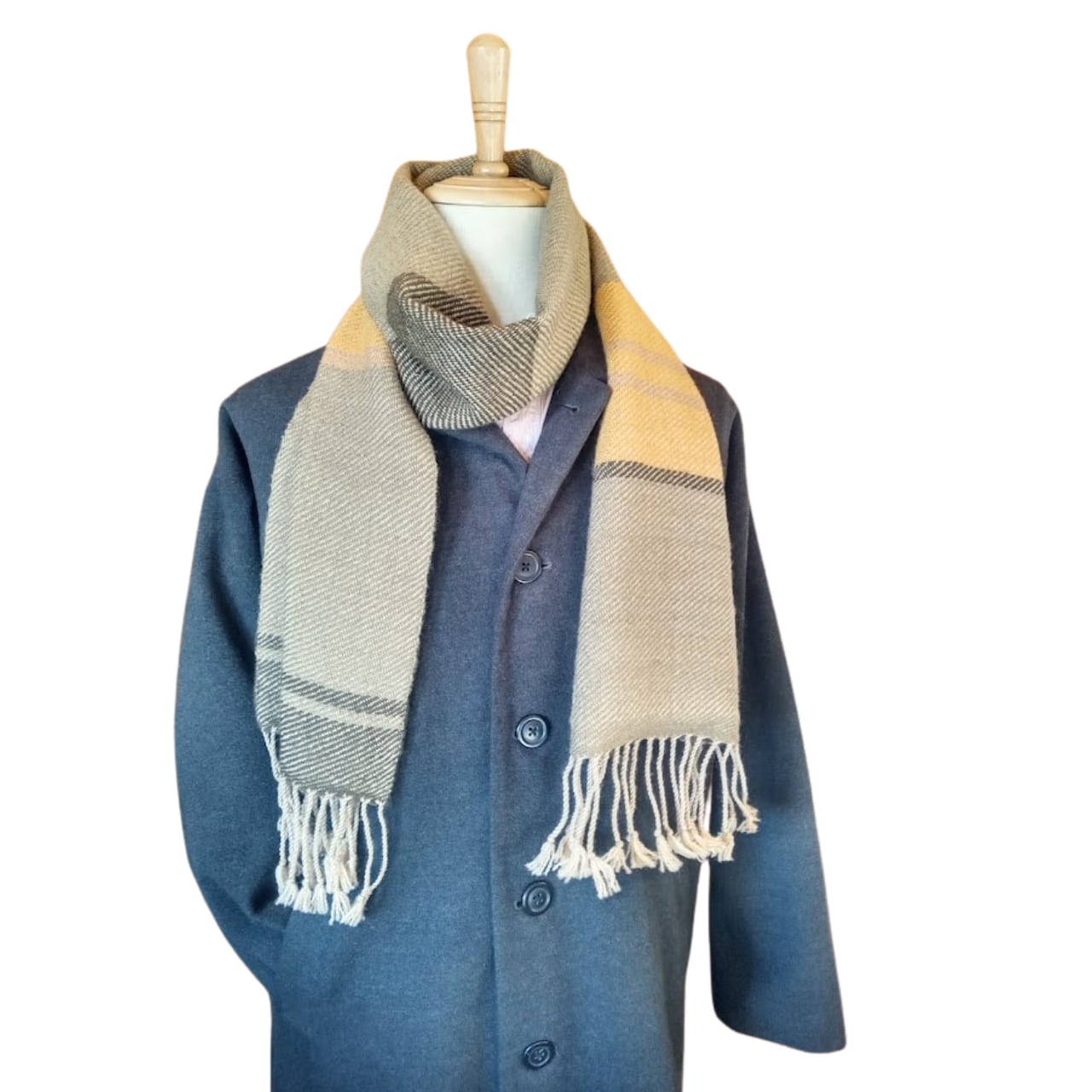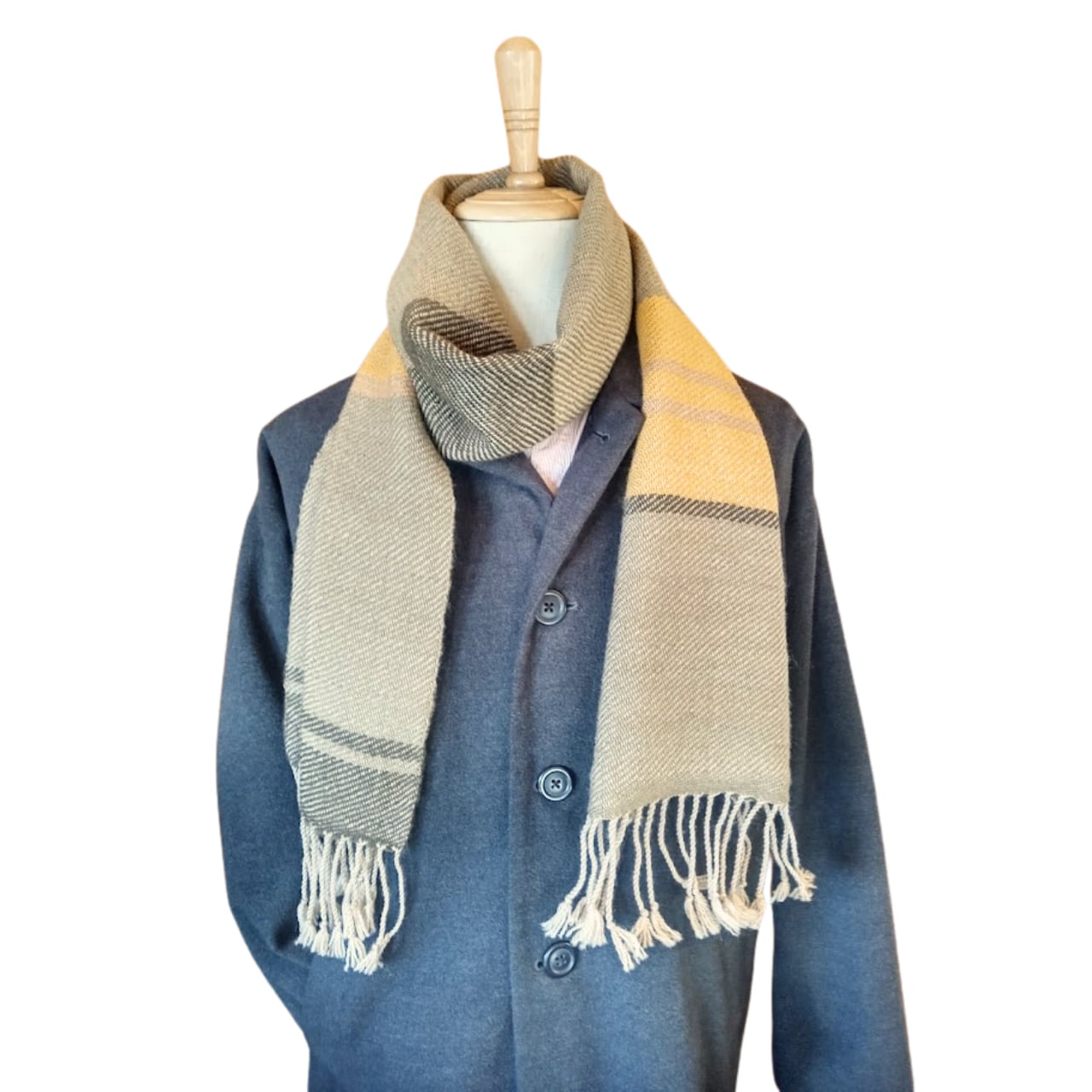季節を纏う — 草木染めウールの手織りマフラー ― カーキのランダム縞・綾織 ―
