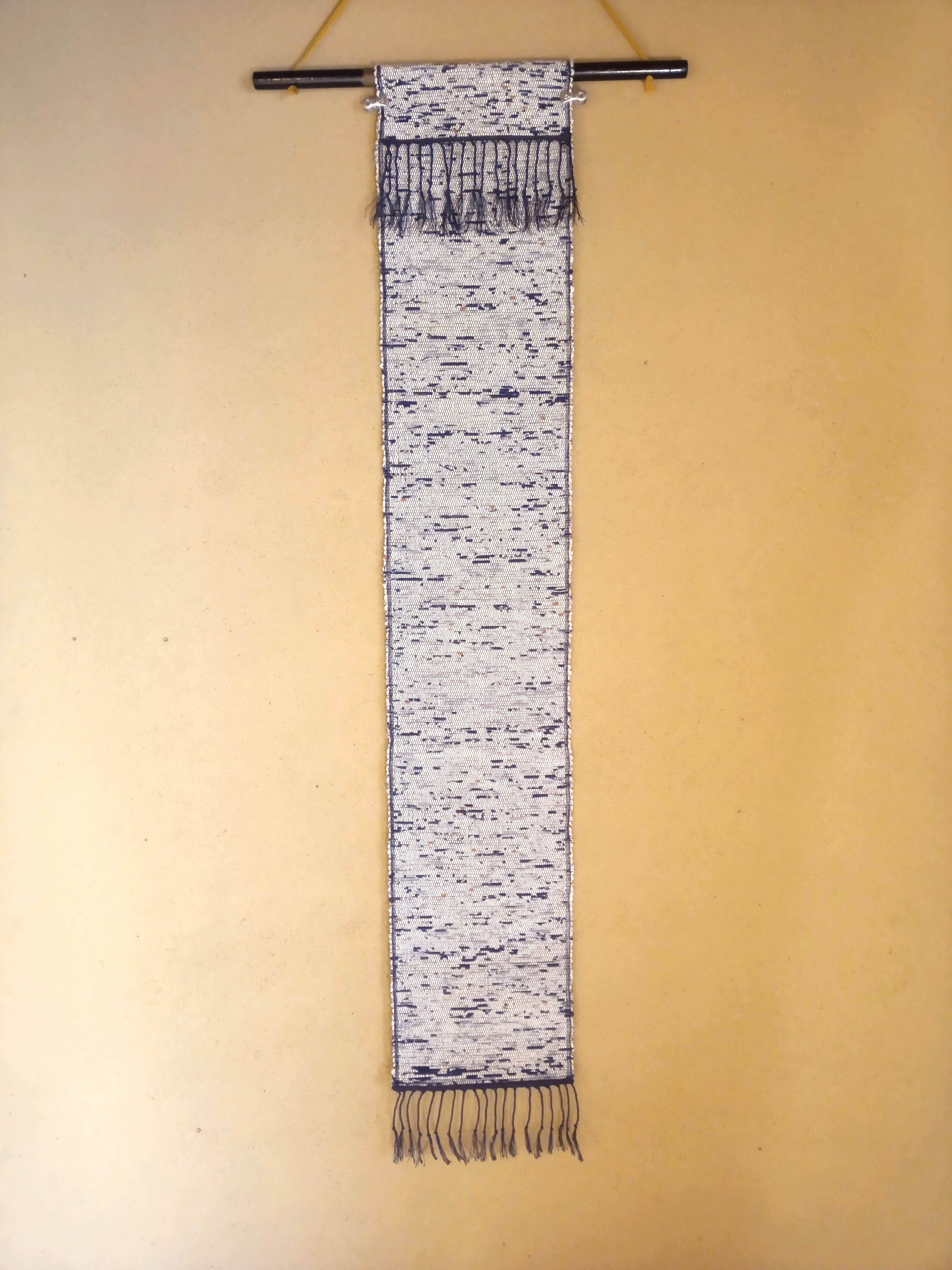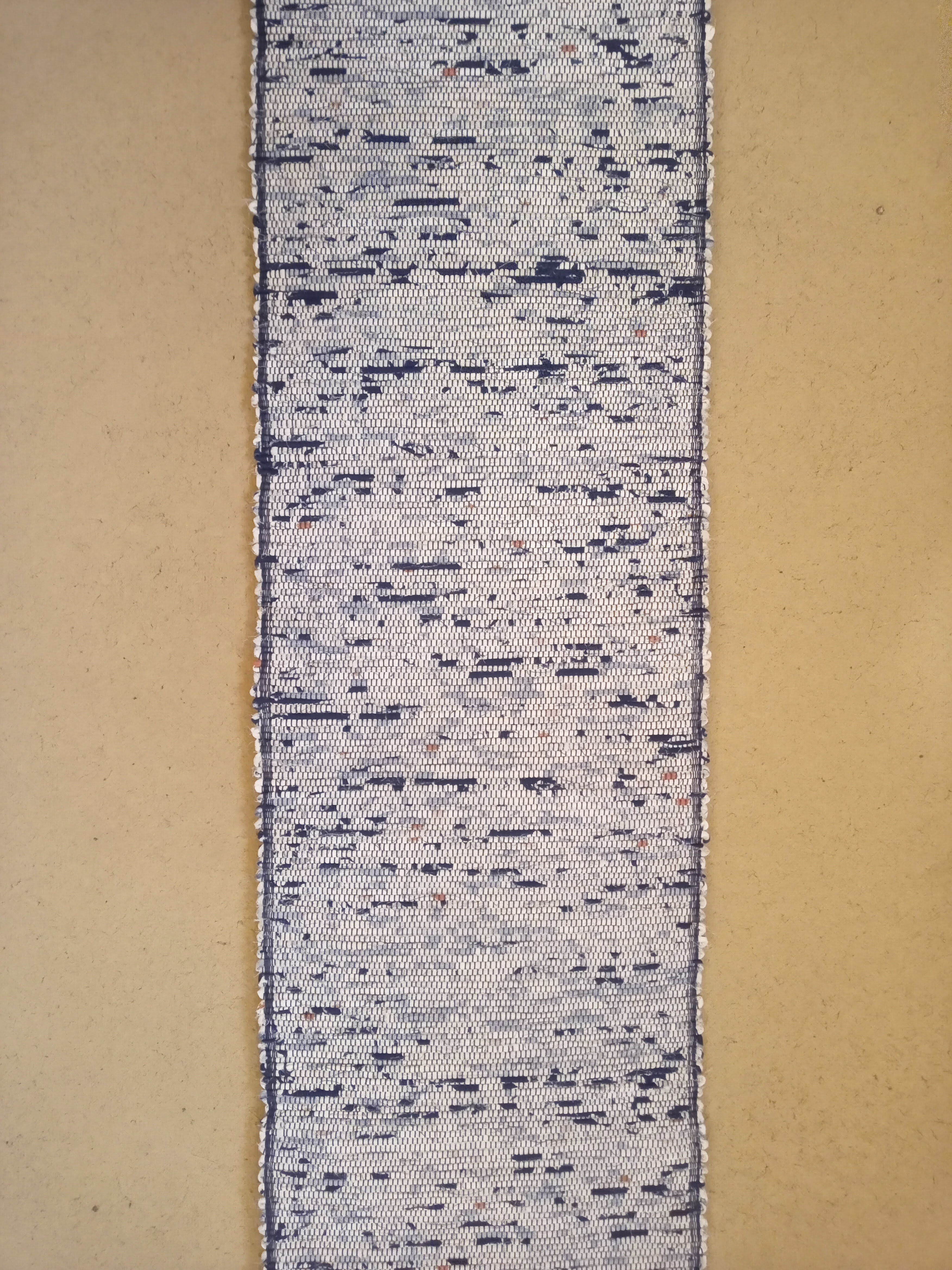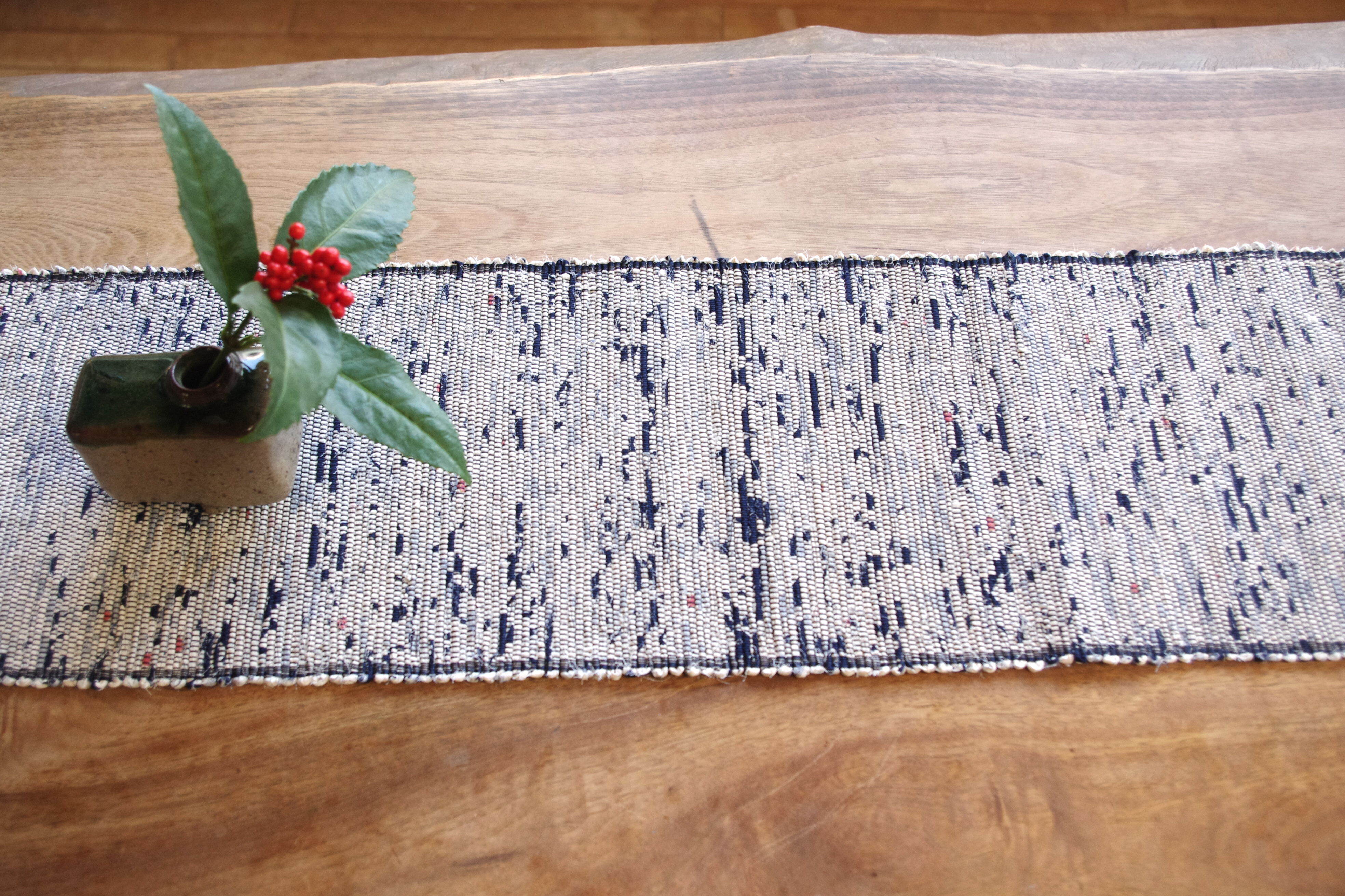 裂き織りというノスタルジックな織物でありながら、白と紺のコントラストが印象で、今日の生活の中でも面白く使える柄だと思います。アップサイクルが評価されている昨今ですが、裂き織りは昔からある布の再利用の知恵のひとつです。