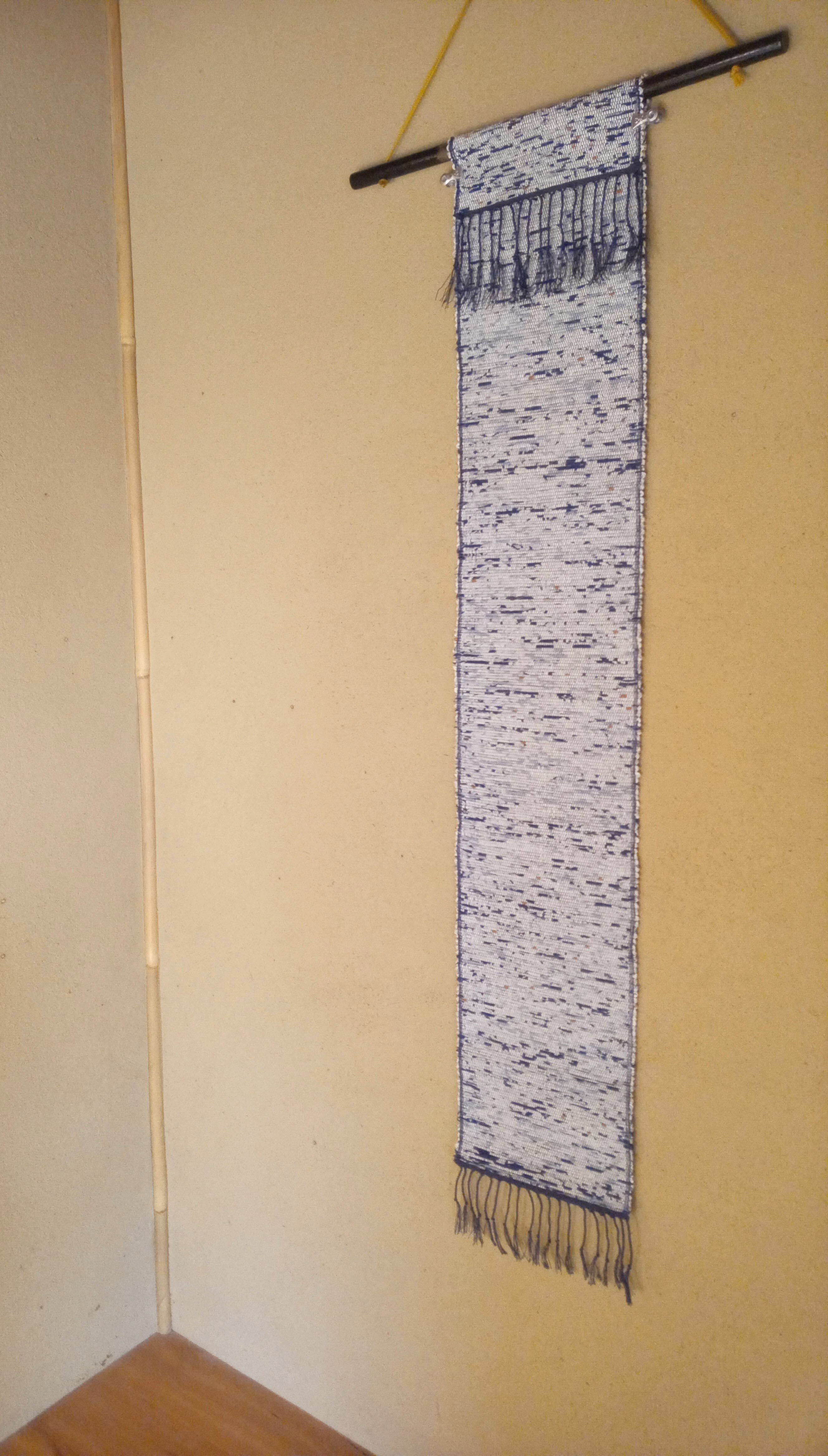 こちらの商品は、たて糸は紺色の糸、よこ糸に着物などの布をテープ状に切ったものを織り込んでいます。