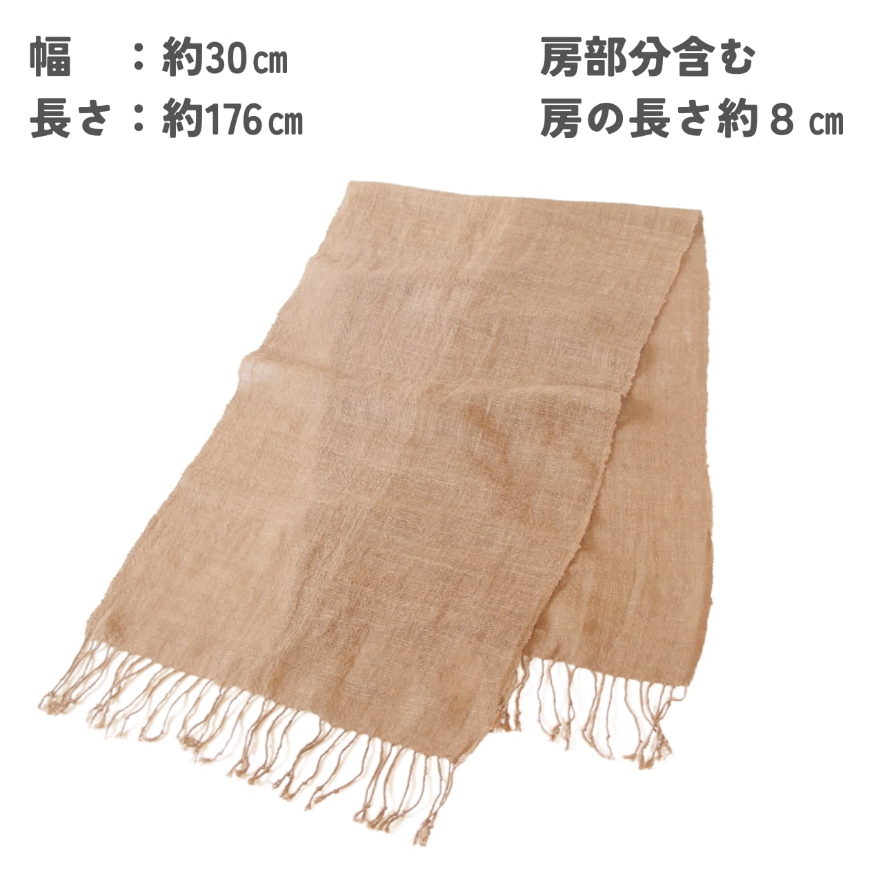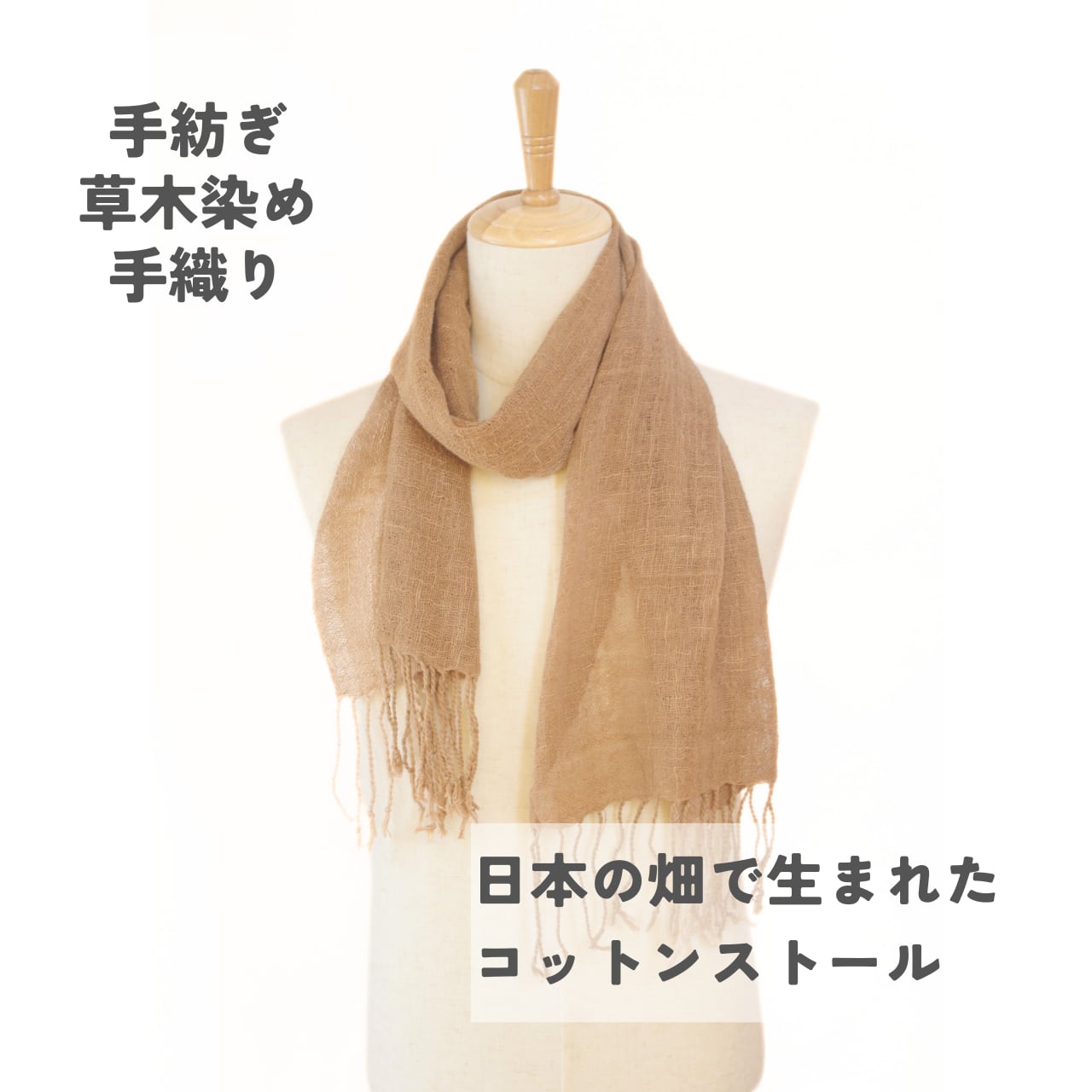 和棉・胡桃染めの手織りストール|日本の畑から生まれた贈り物 幅:約45㎝、 長さ:約164㎝(房部分含む。)
